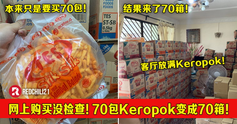 日前新加坡一名巫裔网友在 Twitter 发文求助,家人在网上购买 Keropok 时摆了乌龙,误将70包订成了70箱,收到货时超傻眼!