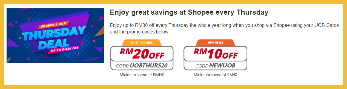 - 新用户必须输入优惠代码 【NEWUOB】;旧用户必须输入优惠代码 【UOBTHURS20】