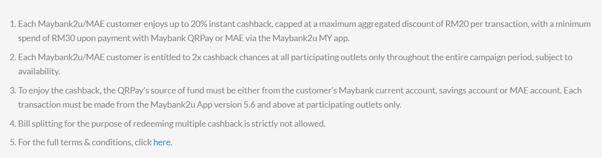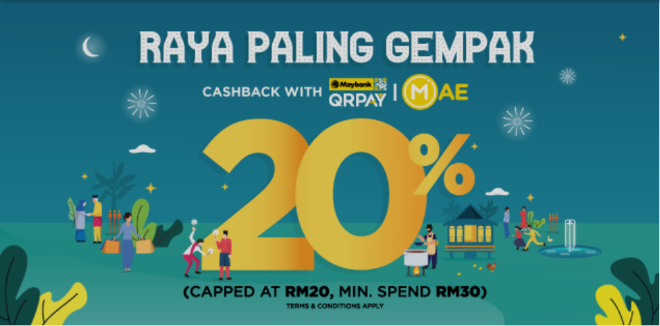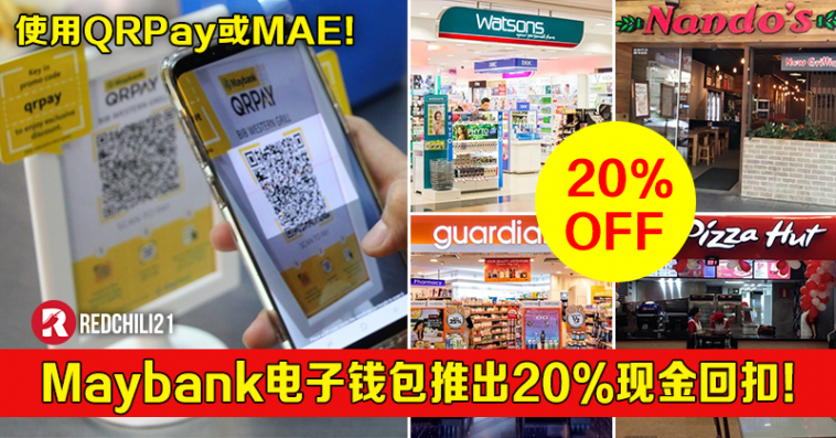 如果你是 Maybank 用户或是拥有 MAE 账户,在消费时使用 Maybank QRPay 或 MAE 来付款,可享有20%现金回扣!