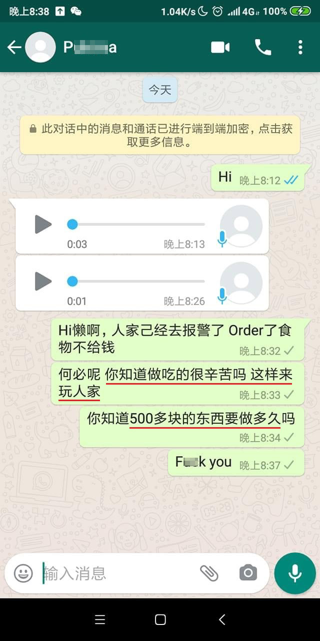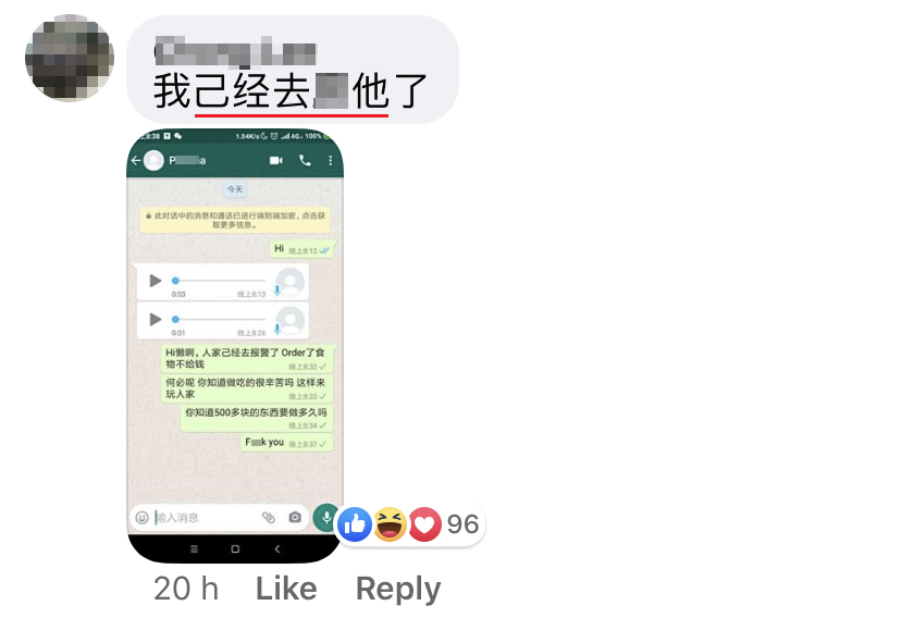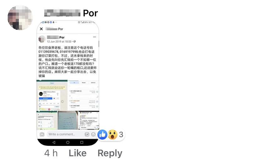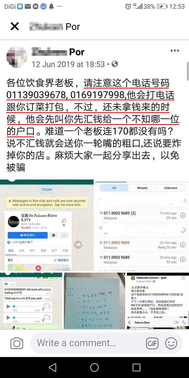 对方也是有提到要我们转账 RM170 给他,我们告诉他要准备那么多食物和饮料没空转账。然后他就不停的打电话来追我们弄好食物送给他(可能是要报复我们没有转账)。