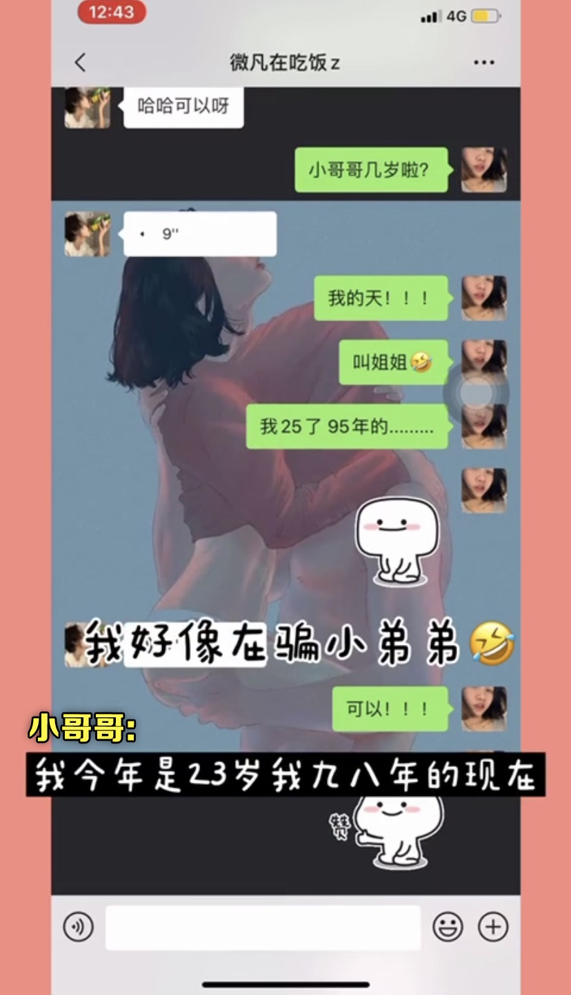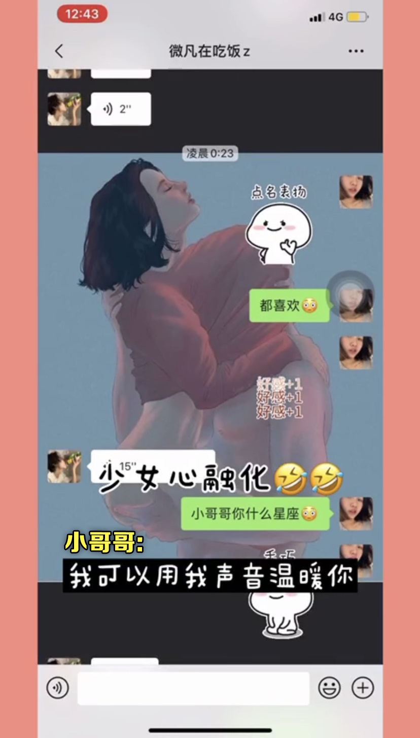 Leona 加了微信(Wechat)以后,就和一位名为“微凡在吃饭z”的“虚拟男友”开始聊天。该“小哥哥”声称自己是年仅23岁的男大学生,Leona称赞他的声音好听,而且很会聊天!