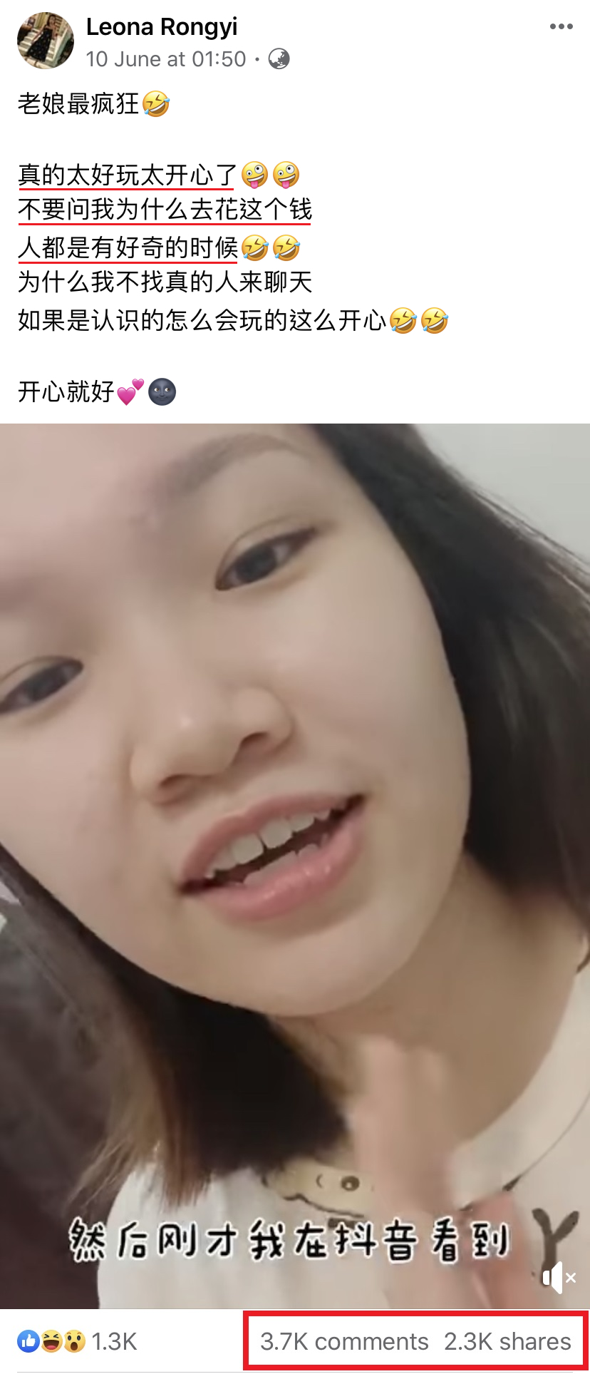 Leona通过面子书分享一段长达2分50秒的影片,她在影片里说道自己在抖音App里看到很多网友为闺蜜订购“虚拟男友”。出于好奇心,Leona 就在淘宝网搜寻相关字眼,没想到真的有这样的“商品”,Leona决定玩玩看!