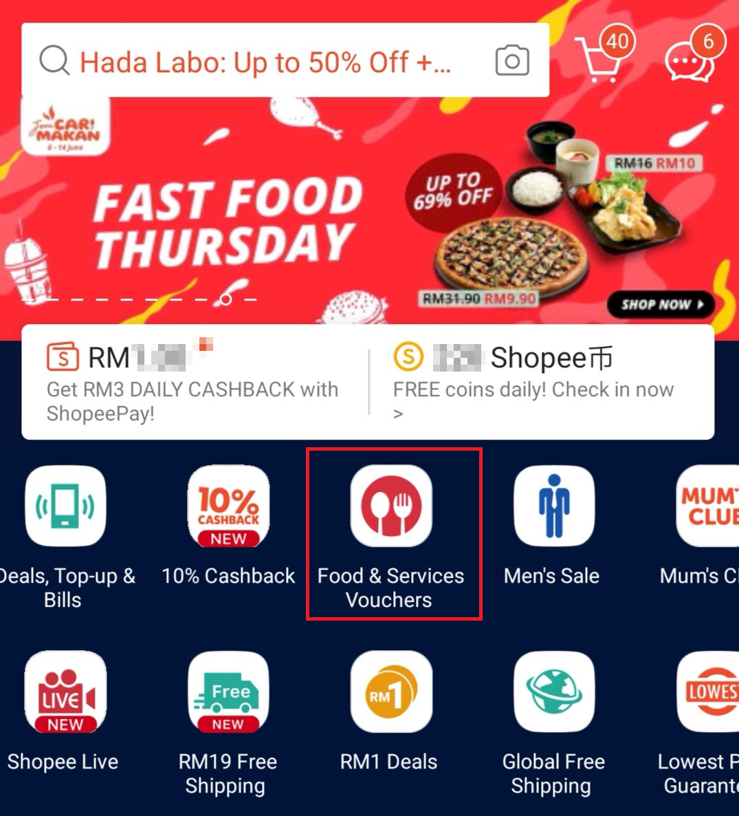▼ 你只需打开 Shopee App ,点击「Food & Service Voucher」!