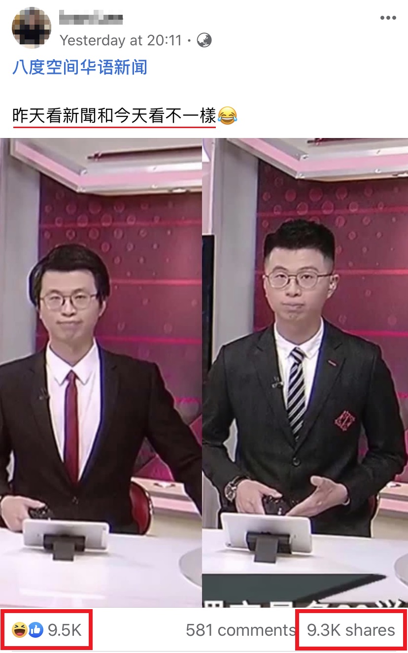 原PO在帖文里Tag了《8度空间华语新闻》的面子书专页,然后写道:「昨天看新闻和今天看不一样!」