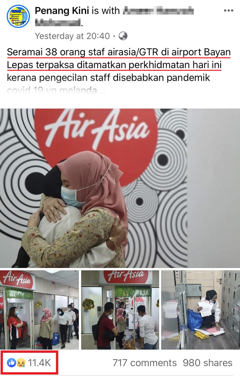 昨天《Penang Kini》面子书专页就PO文分享,槟城国际机场有38位的亚航职员因为这次的疫情而遭解雇,其中包括了长达15年的老员工。