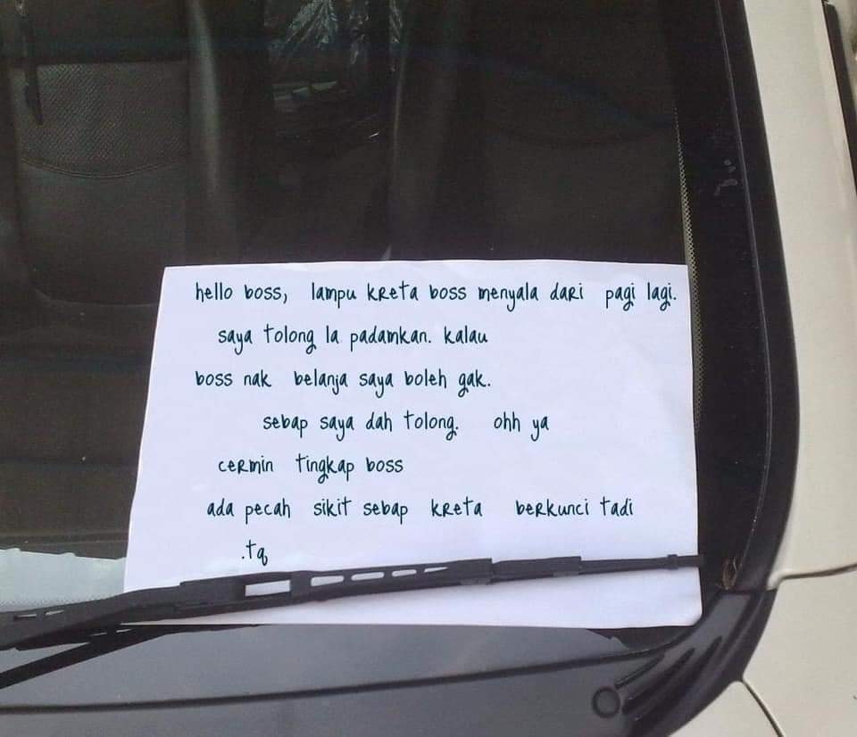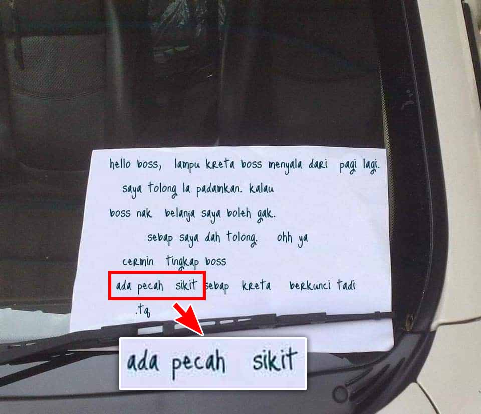 ▼ 「Cermin tingkap boss ada pecah sikit」字条上是这样写的… 裂一点而已。