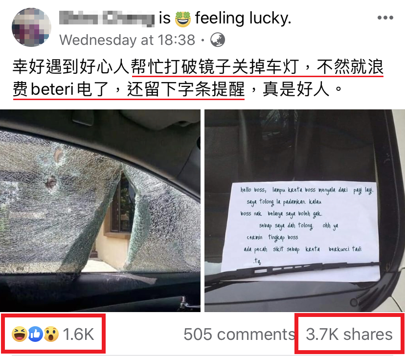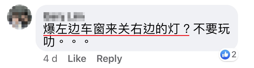 一名大马网友在面子书发文,车主在离开车子以前忘记关车灯,结果被一位“好心人”看见,就打爆副驾驶座的车镜帮他关灯。