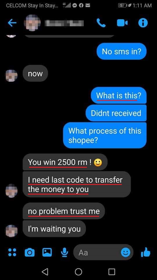 今天晚上收到朋友老公发来的 Messenger,要我 copy sms 的 code,用来参加 Shopee 的不懂什么活动。