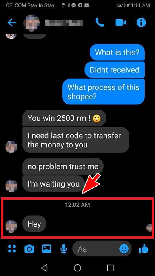 故事没完,他还不死心因为 RM1723.00 还没到手,在 Messenger 里12:02am 还来跟我打招呼 said “Hey”!