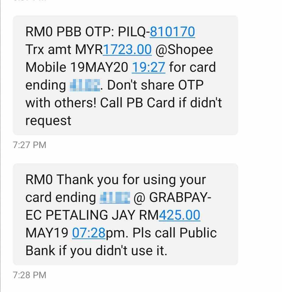 可是还没来的急打电话给 Public Bank credit card center。在 7:28pm 我又收到 Public Bank 的 sms,我的信用卡过账去 Grab Pay RM425.00 是在没有输入 OTP code 的情况下转账了。