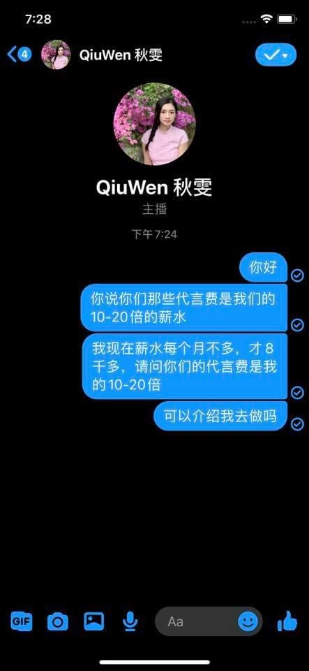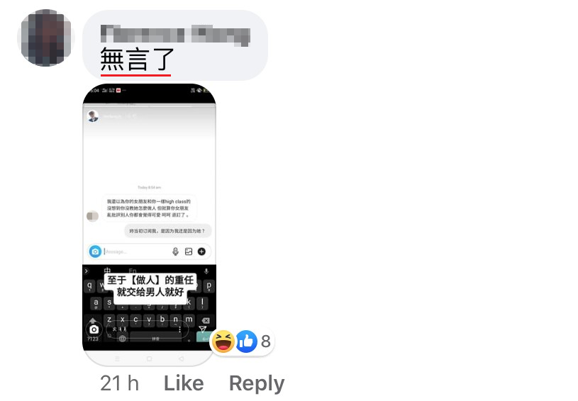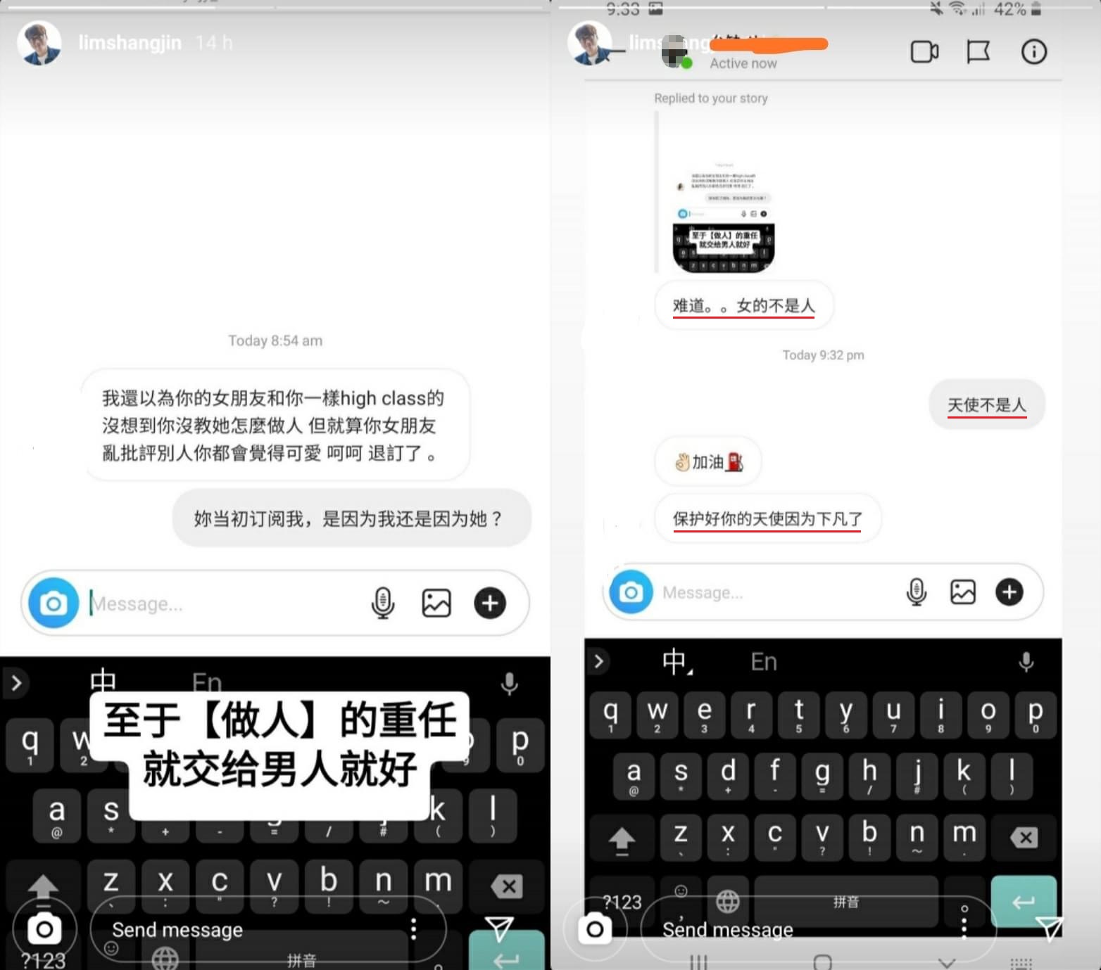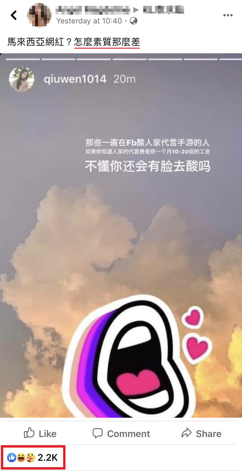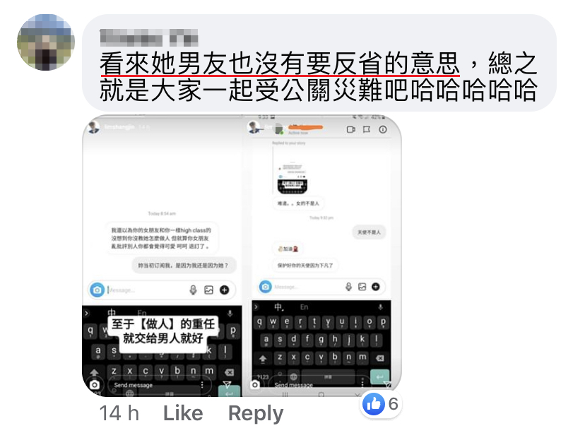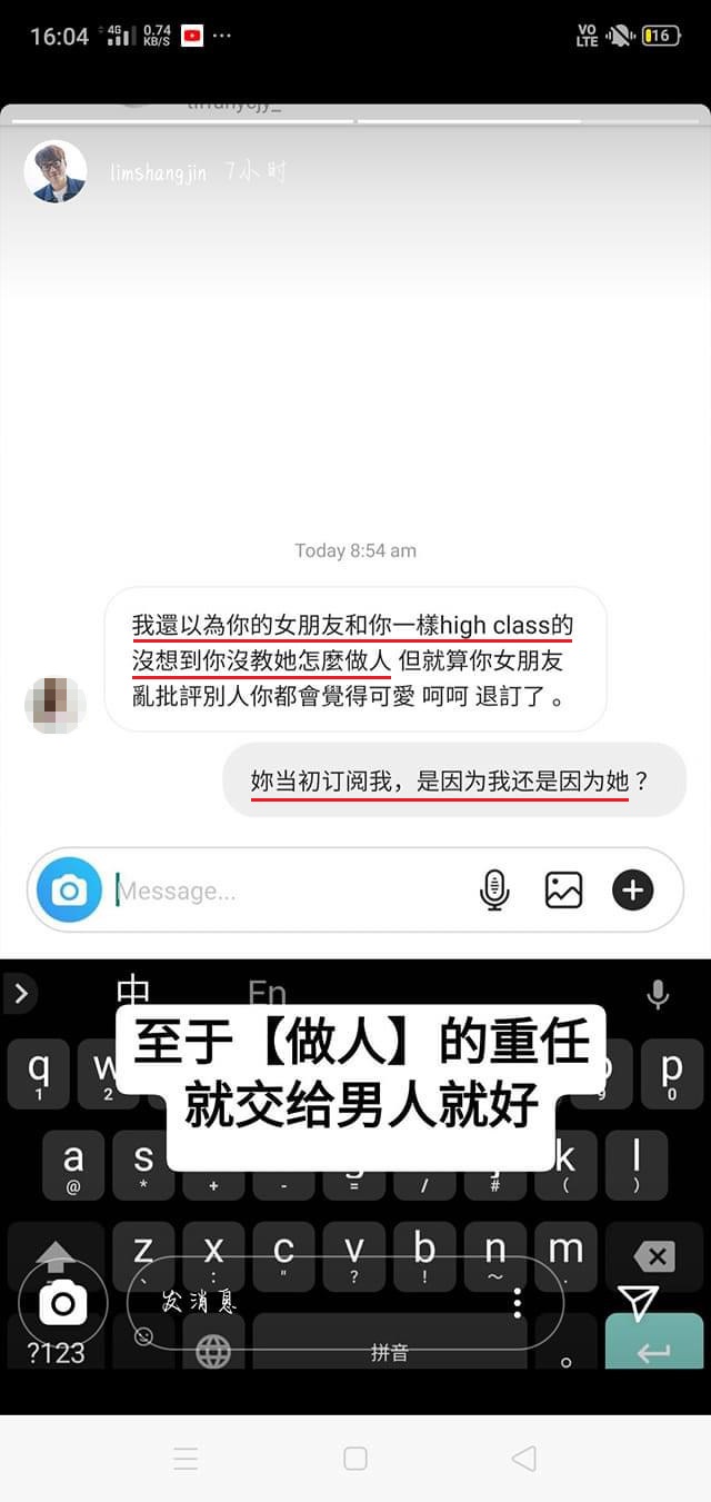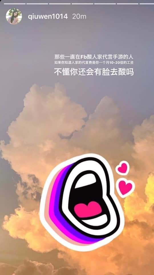 林尚进的女友秋雯随后在 Instagram Story 上传一张图并写道:「那些一直在FB酸人家代言手游的人,如果你知道人家的代言费是你一个月10-20倍的工资,不懂你还会有脸去酸吗?」