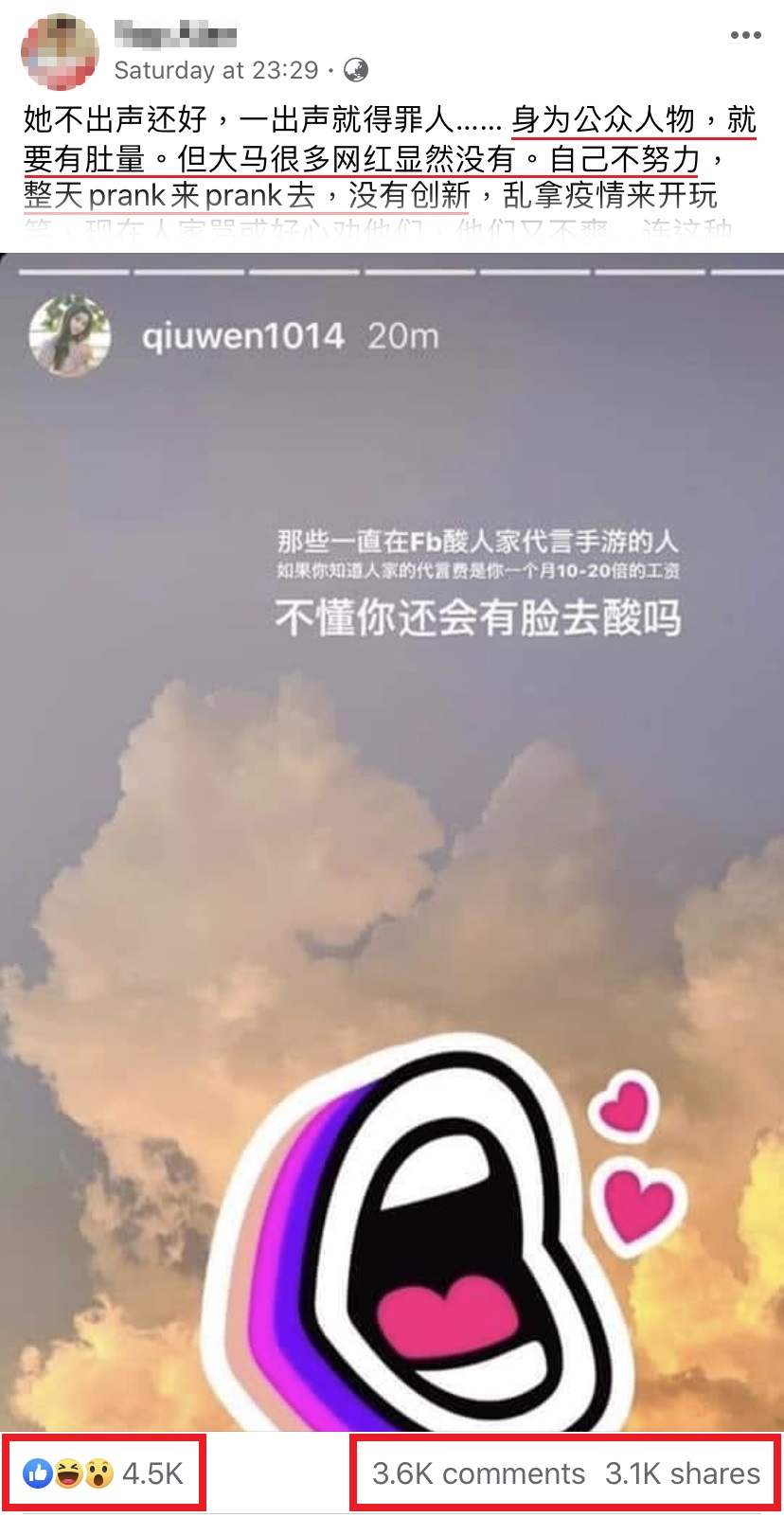 她不出声还好,一出声就得罪人…… 身为公众人物,就要有肚量。但大马很多网红显然没有。自己不努力,整天prank来prank去,没有创新,乱拿疫情来开玩笑,现在人家骂或好心劝他们,他们又不爽… 连这种事都不能忍,很多又不改掉自己的坏脾气或公主病,就说人家鄙视他们。