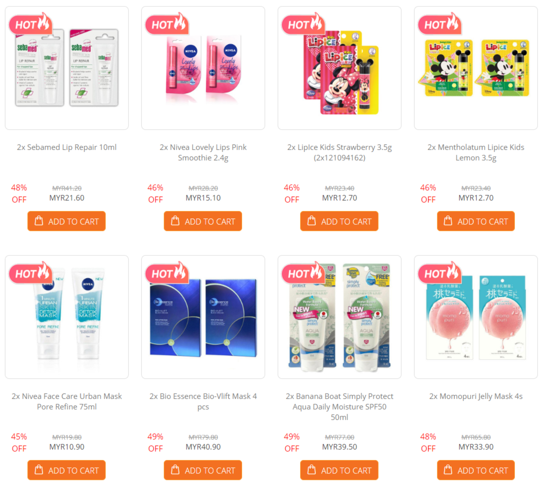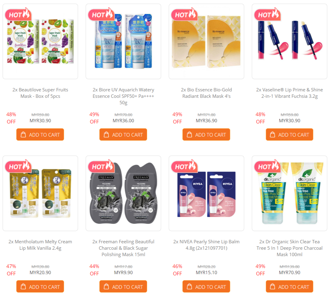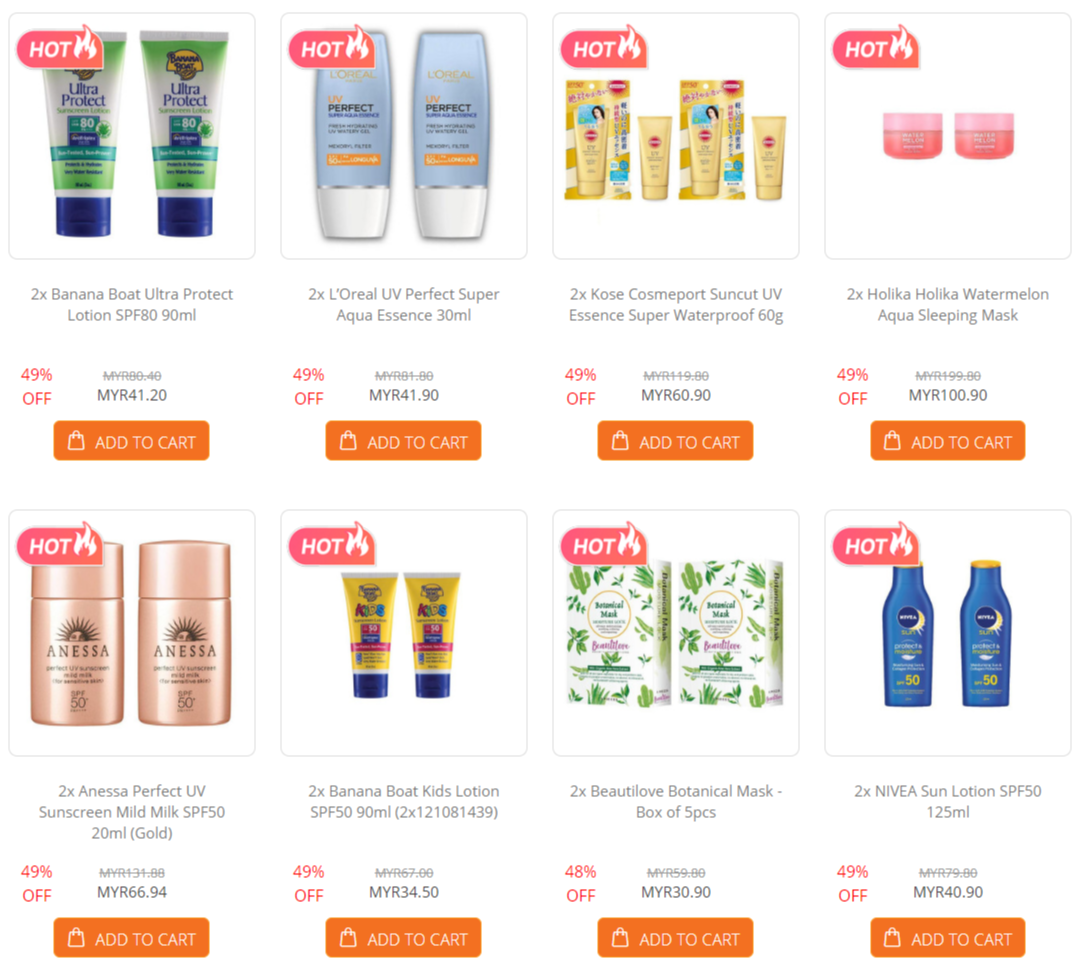 在这次优惠中,促销的商品包括:防晒霜、面膜及护唇用品,都可享有折扣高达50%优惠!