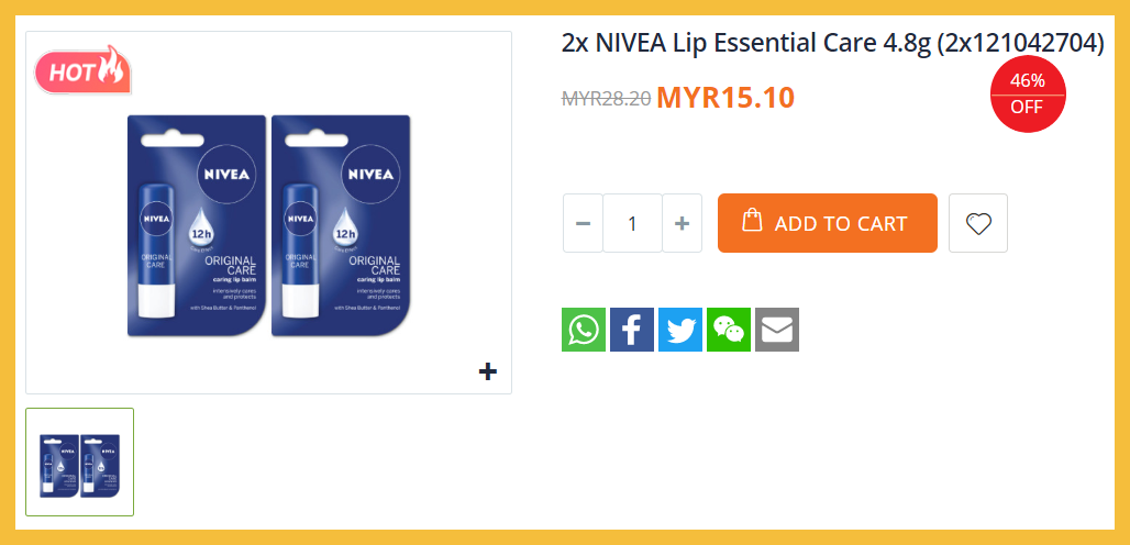 ▼ 2x NIVEA Lip Essential Care 4.8g —— 只需RM15.10(原价RM28.20)