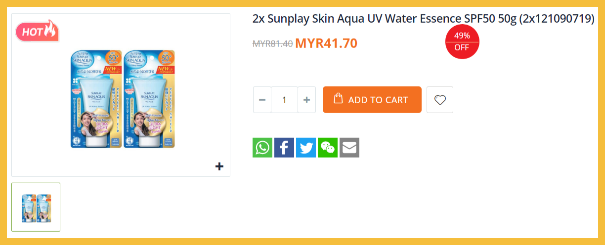 ▼ 2x Sunplay Skin Aqua UV Water Essence SPF50 50g —— 只需RM41.70(原价RM81.40)