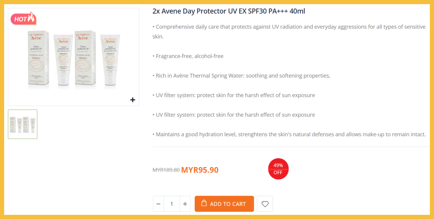 ▼ 2x Avene Day Protector UV EX SPF30 PA+++ 40ml —— 只需RM95.90(原价RM189.90)