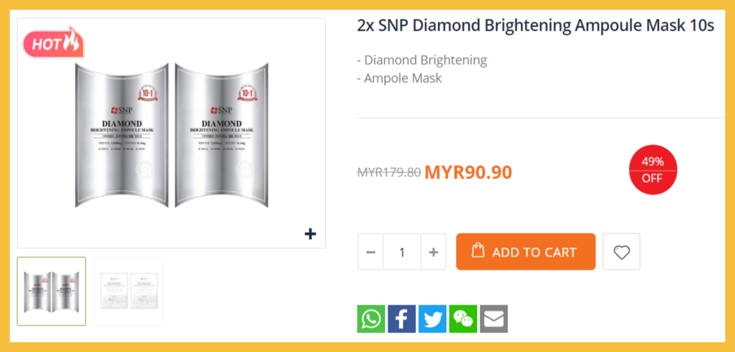 ▼ 2x SNP Diamond Brightening Ampoule Mask 10s —— 只需RM90.90(原价RM179.80)