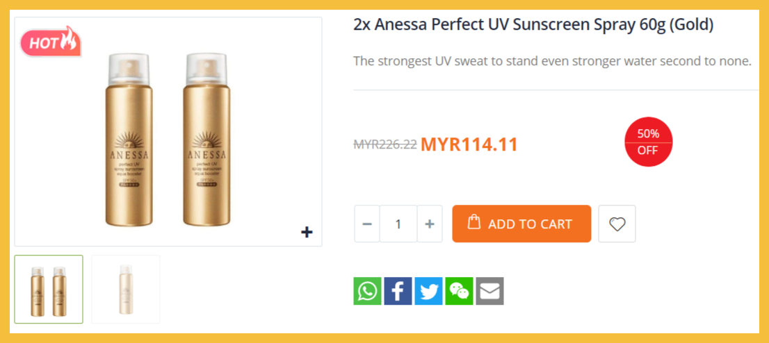▼ 2x Anessa Perfect UV Sunscreen Spray 60g —— 只需RM114.11(原价RM226.22)