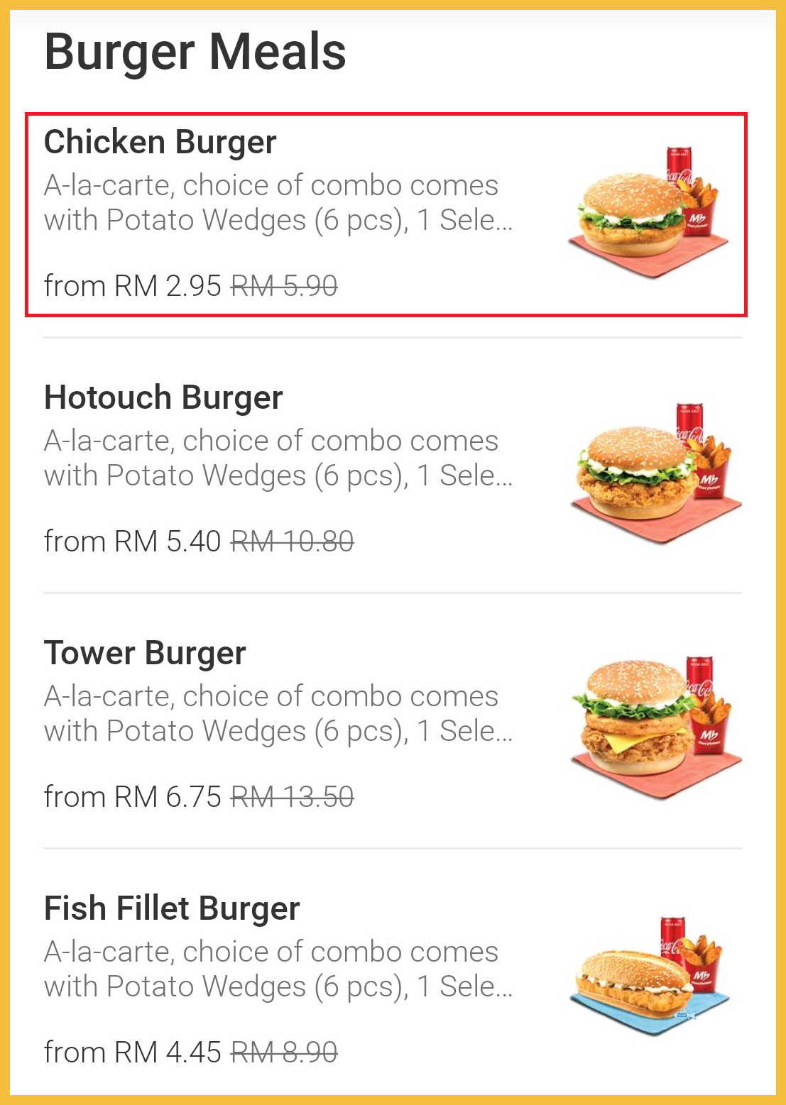 步骤2: 选择你想吃的食物或套餐。例如:Chicken Burger