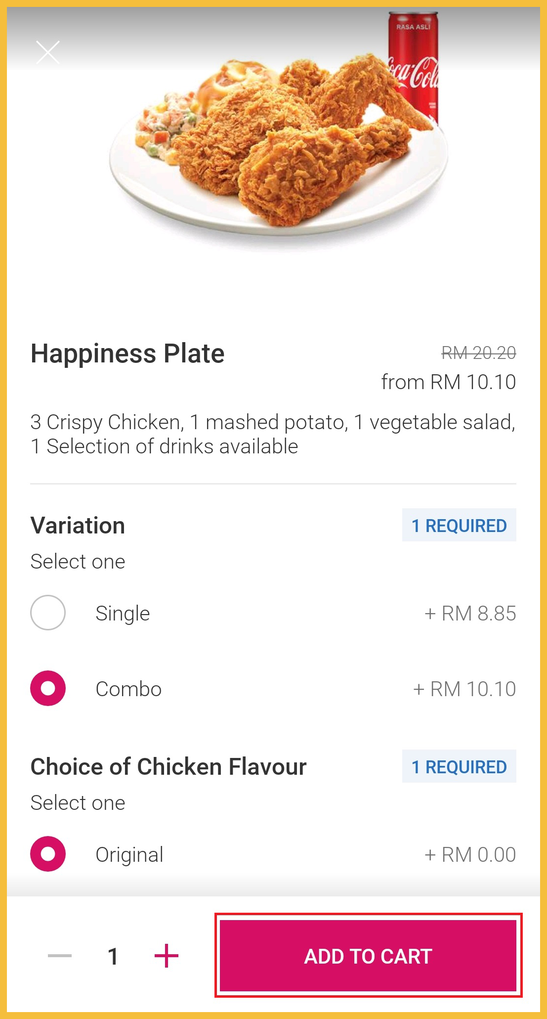 ▼ 2份 Happiness Plate 炸鸡套餐原价RM40.40 ,折扣后只需RM15.20!相等于一份炸鸡套餐只需RM7.60!太值得吃了!