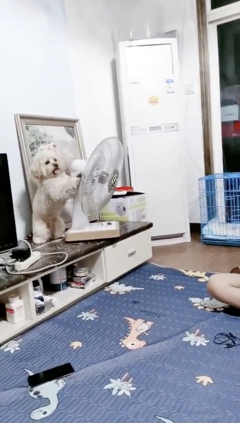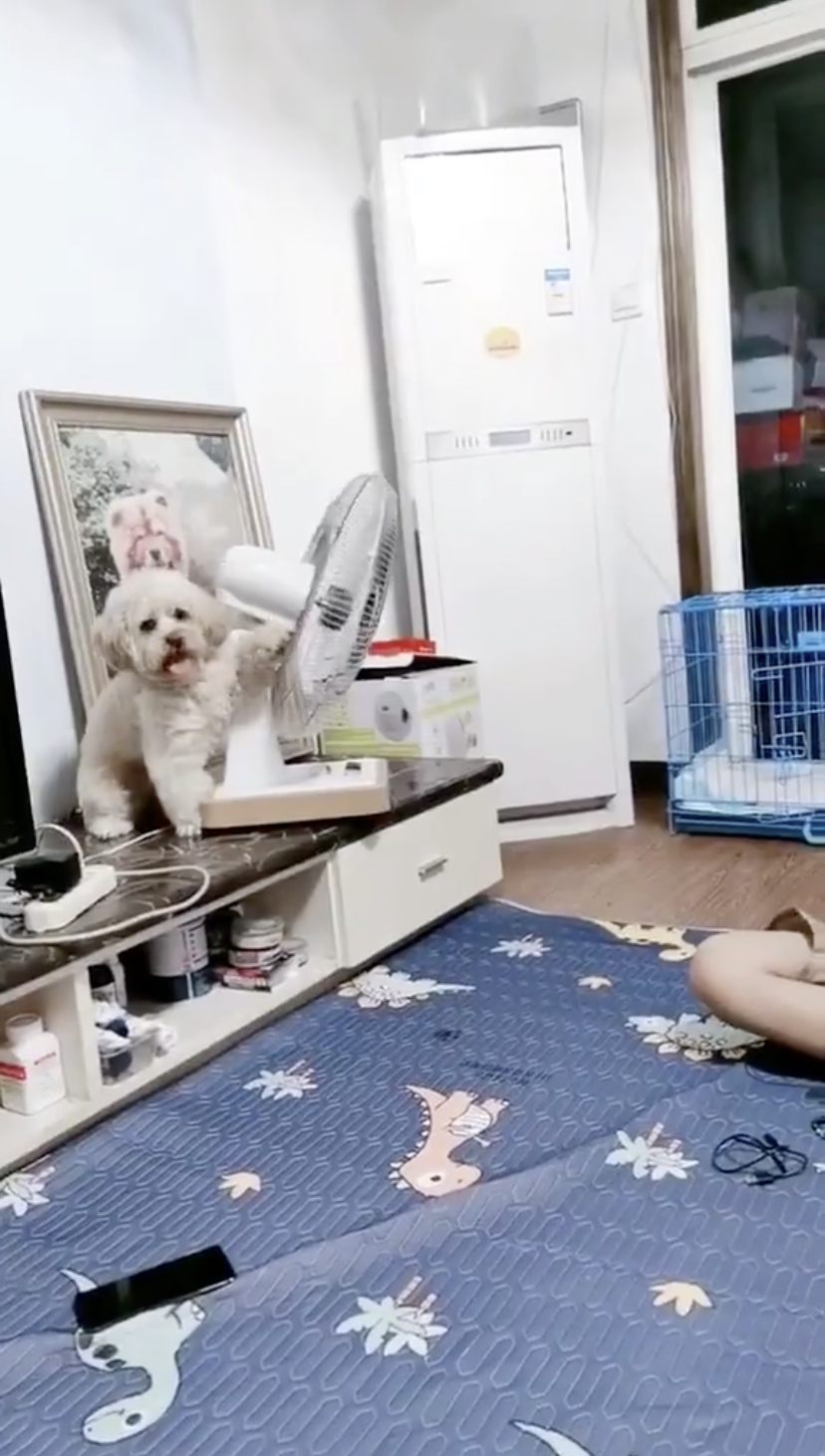 ▼ 或许是平时看多了主人的“乔风扇”的举动,小狗也学会了!它静悄悄地从笼子里出来以后,就跳上矮柜并走到电风扇的后方,将原本吹着主人的电风扇转向狗笼的方向。