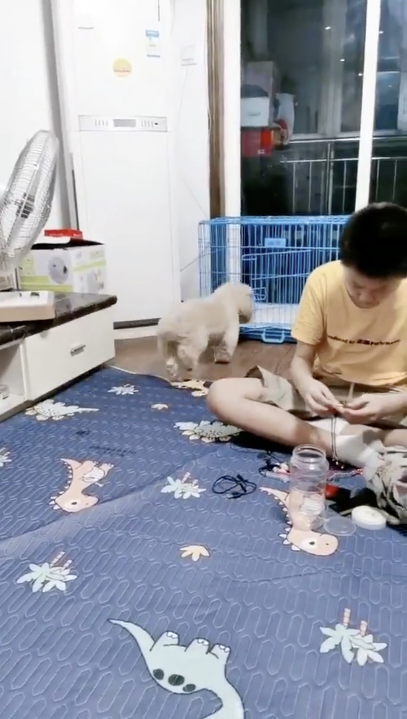 ▼以最舒服的姿势地趴着笼子里吹风扇。旁边的主人都看得目瞪口呆,被狗狗可爱的举动逗笑!