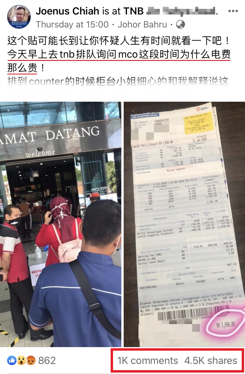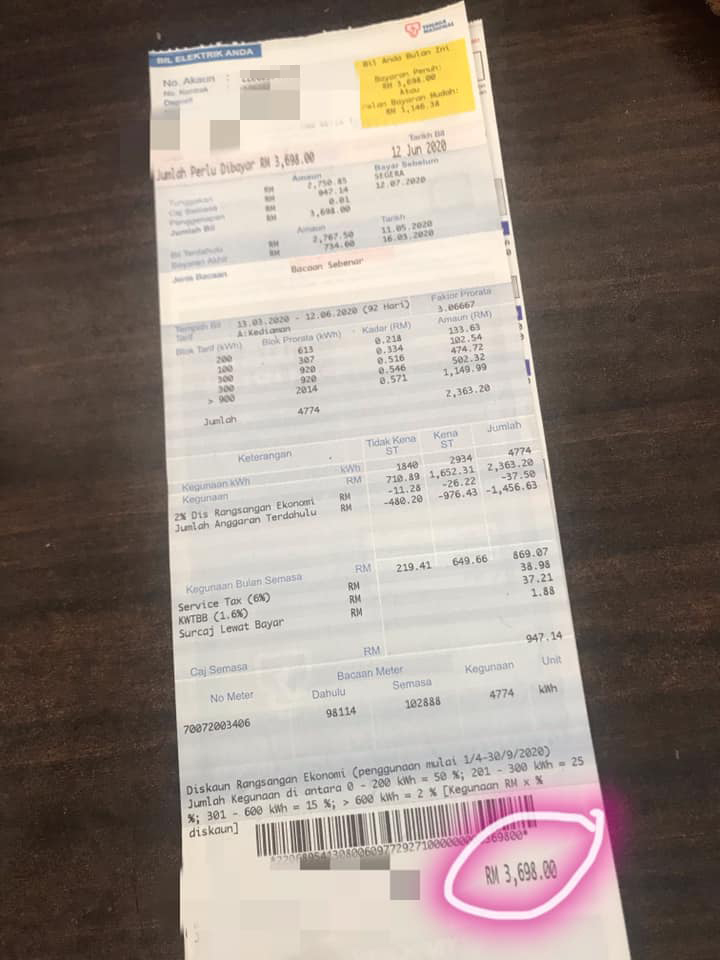 近日一名大马网友 Joenus 在面子书发文写道近期收到来自电力局的单据,电费总额竟然高达 RM3,700!他决定带着单据到电力局咨询,询问以后所获得的解释是这样!