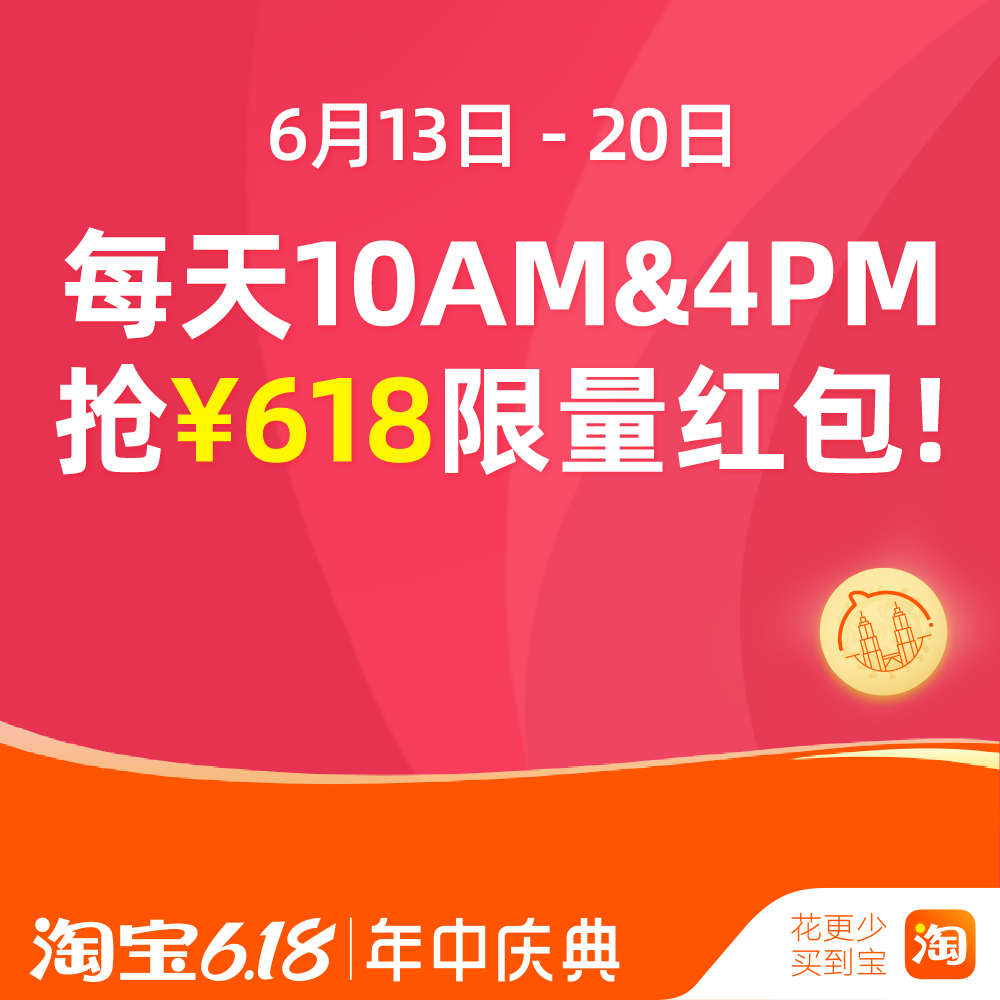 每天10AM & 4PM进淘宝APP抢最高 ¥618的幸运大红包!每个人只有一次机会哦~