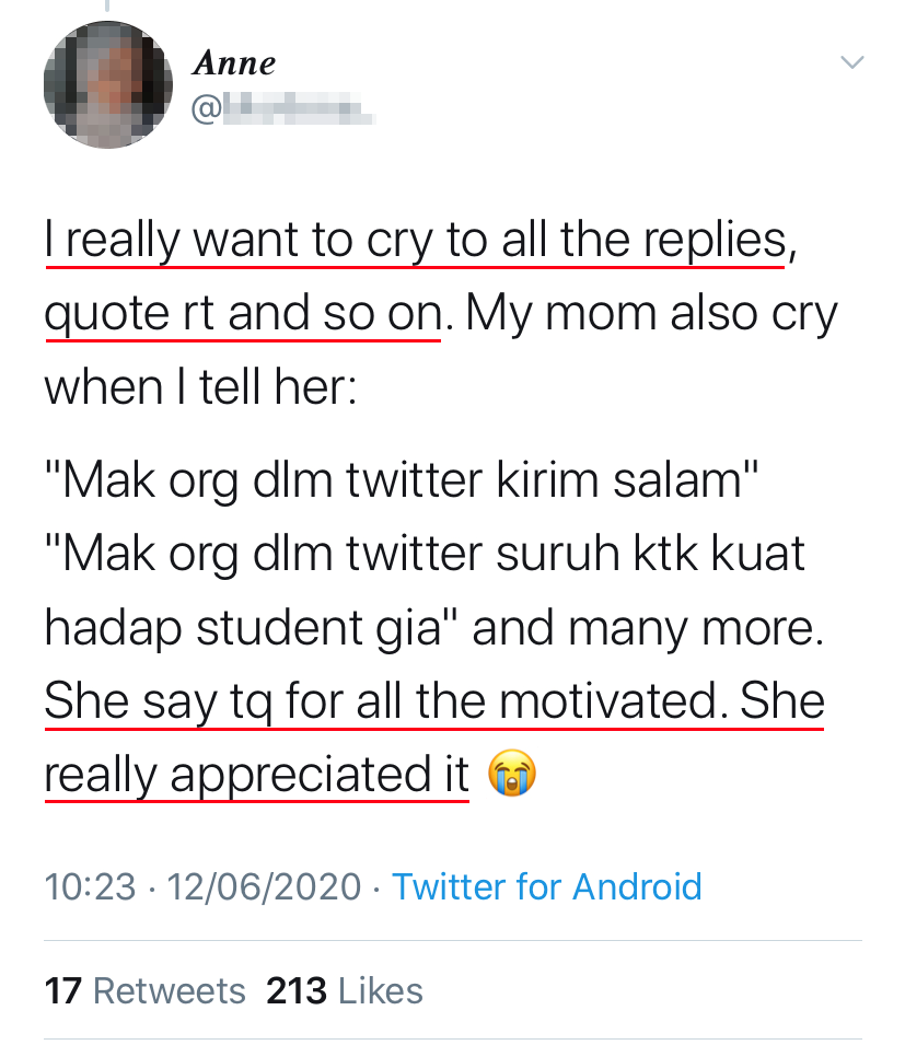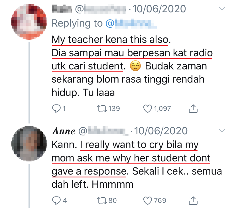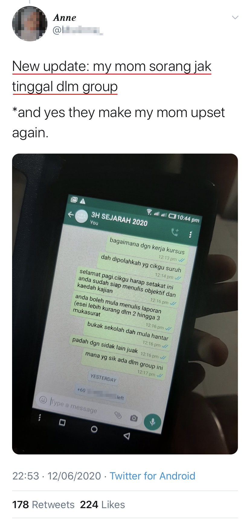 一名大马网友 Anne 在 Twitter 发文指出,母亲的职业是一名老师,她近日在群组里询问学生们的作业进度,没想到学生们不但没有回复,还接二连三地退出群组,最后只剩下老师一个人!