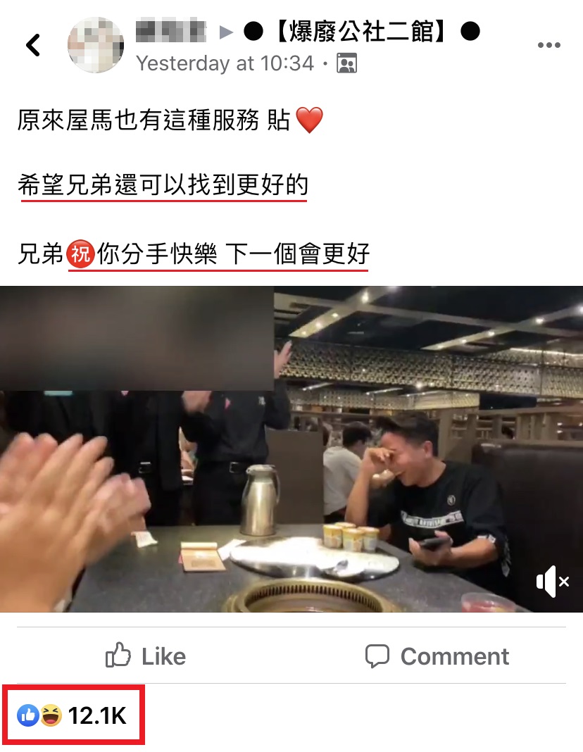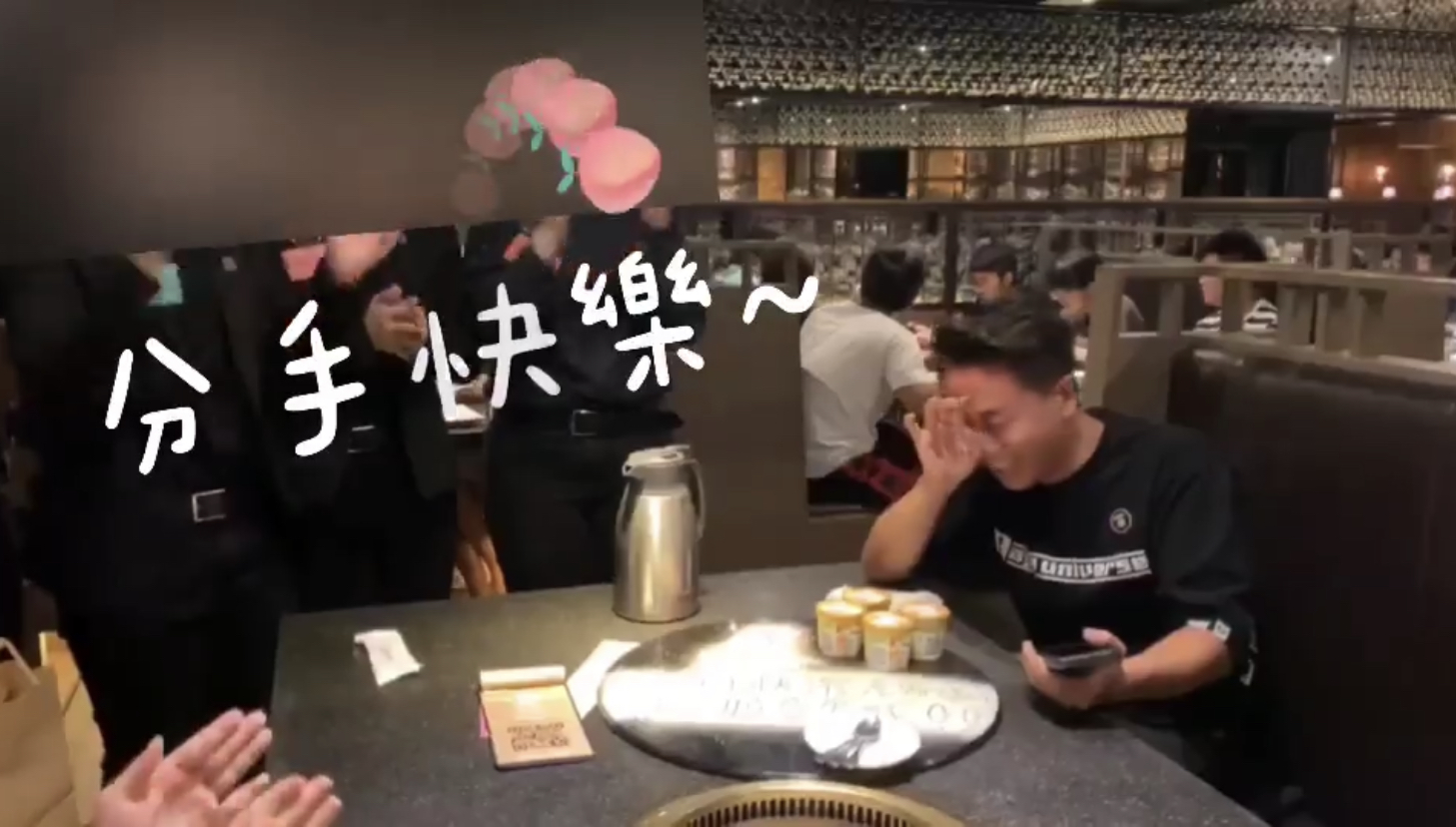 近日社交媒体上流传一段影片,台湾一名男子刚和女友分手,他的好哥儿们为了逗他开心,竟然在餐厅内请店员们大唱《分手快乐》给他听!