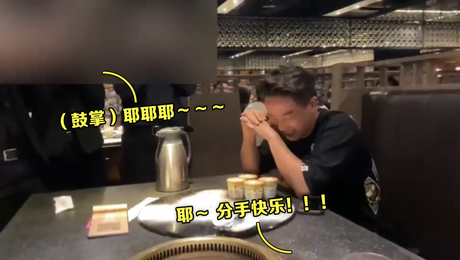 就像唱生日歌一样,现场的气氛十分欢乐,店员们站在餐桌前对着该男子,一边拍手一边开心地唱着《分手快乐》。不知情的人还以为在庆祝生日呢…