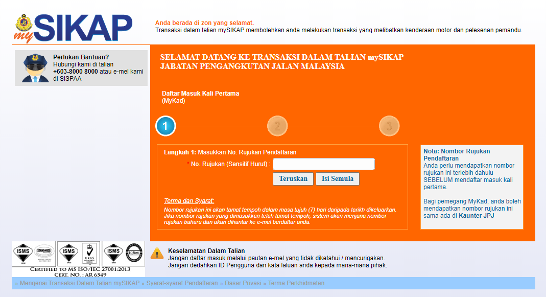 在这里需要注意的是:mySIKAP 使用者必须年满16岁或以上,必须拥有大马卡或护照,而且还需要持有驾驶执照或车辆注册记录。