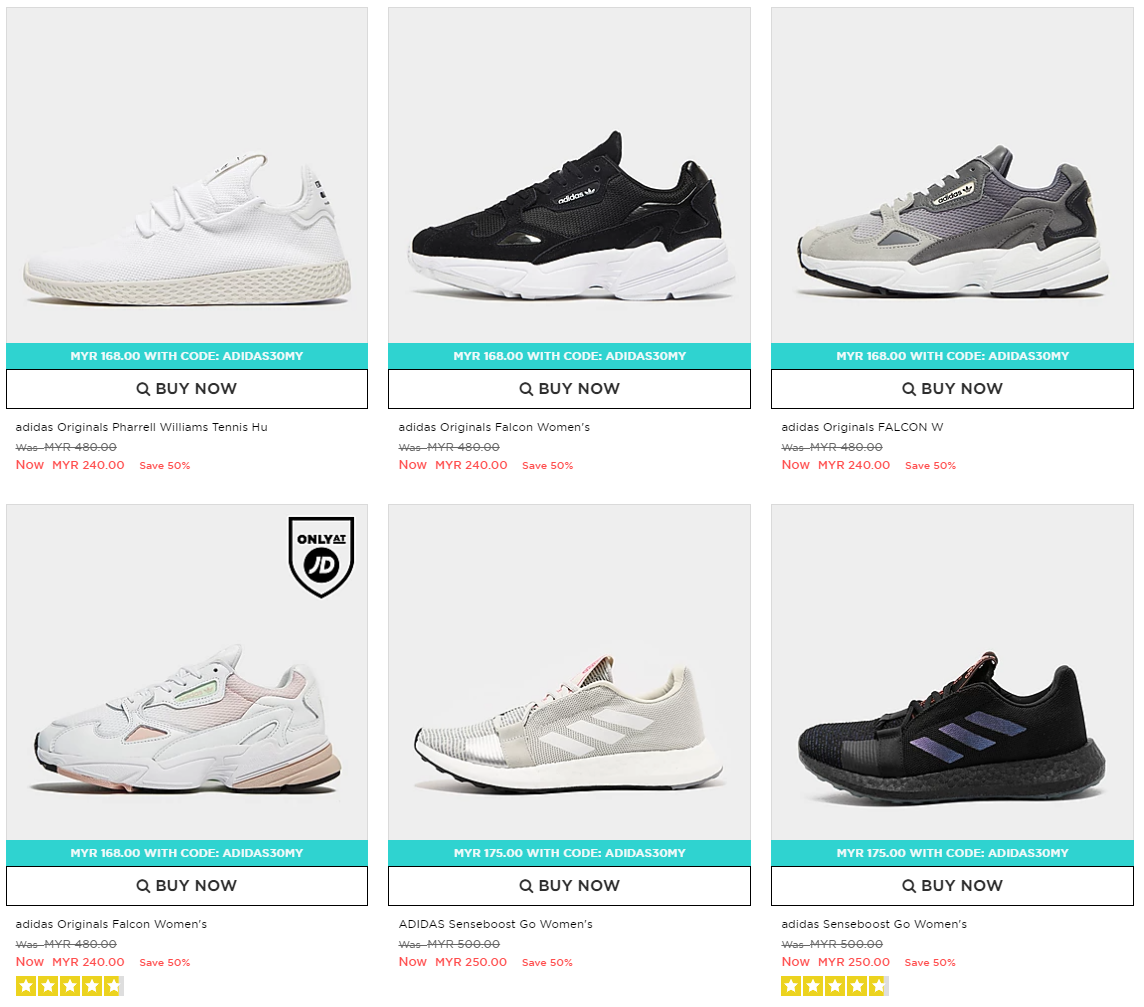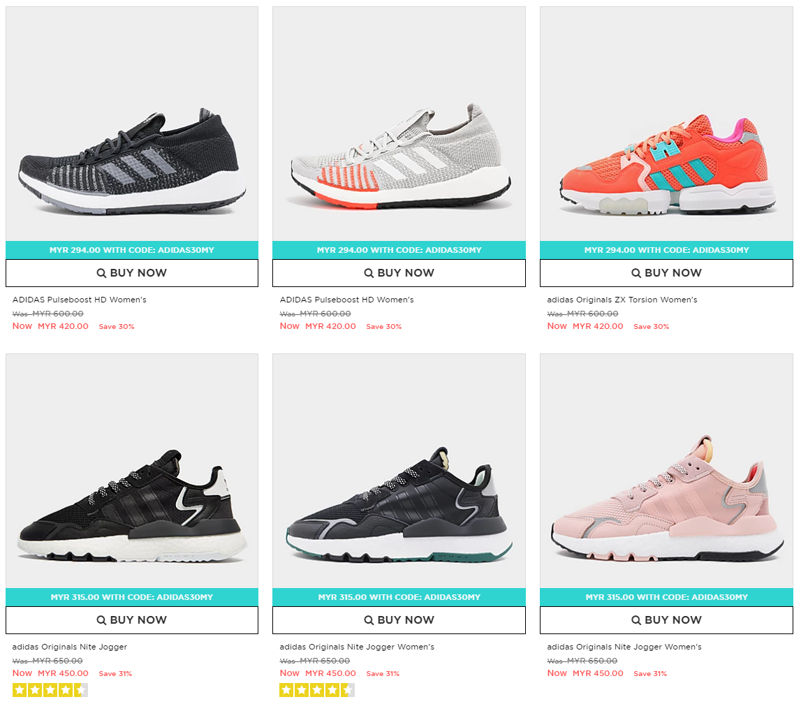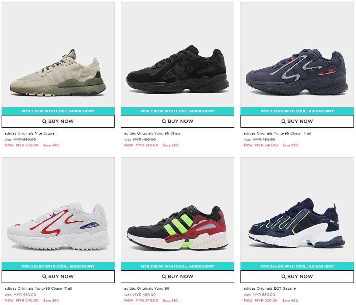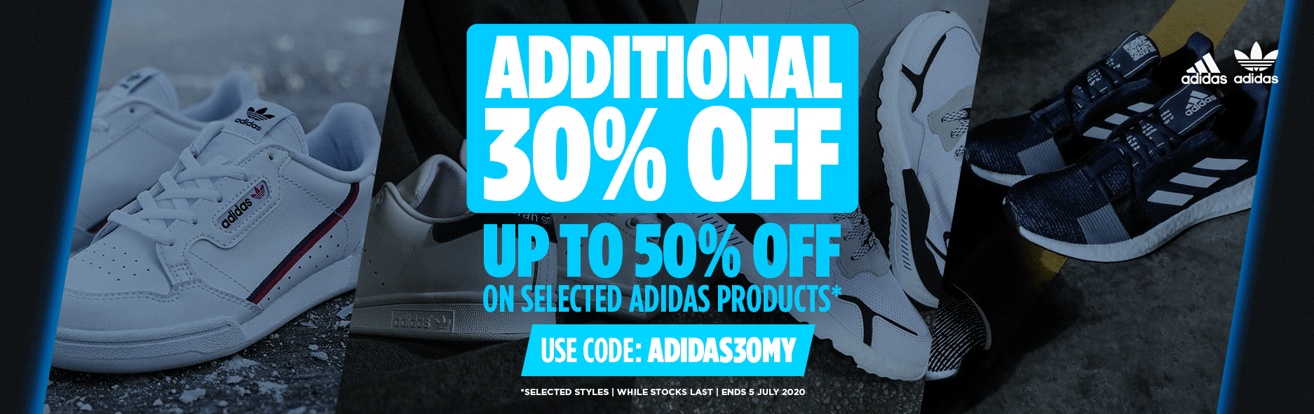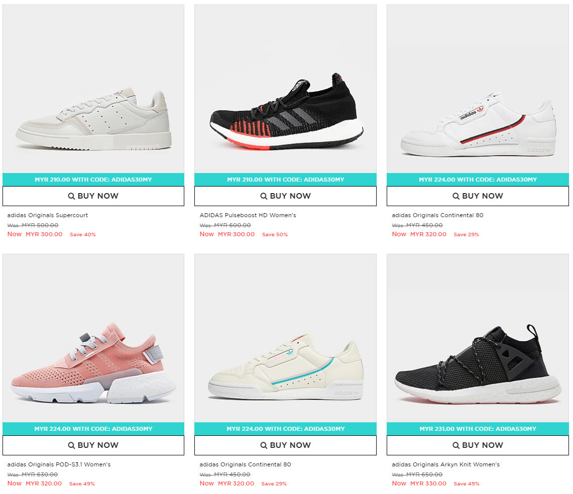 这项优惠是在大马 JD Sports 官方网推出的促销!指定款式 Adidas 鞋子可享有折扣高达50%+30%!