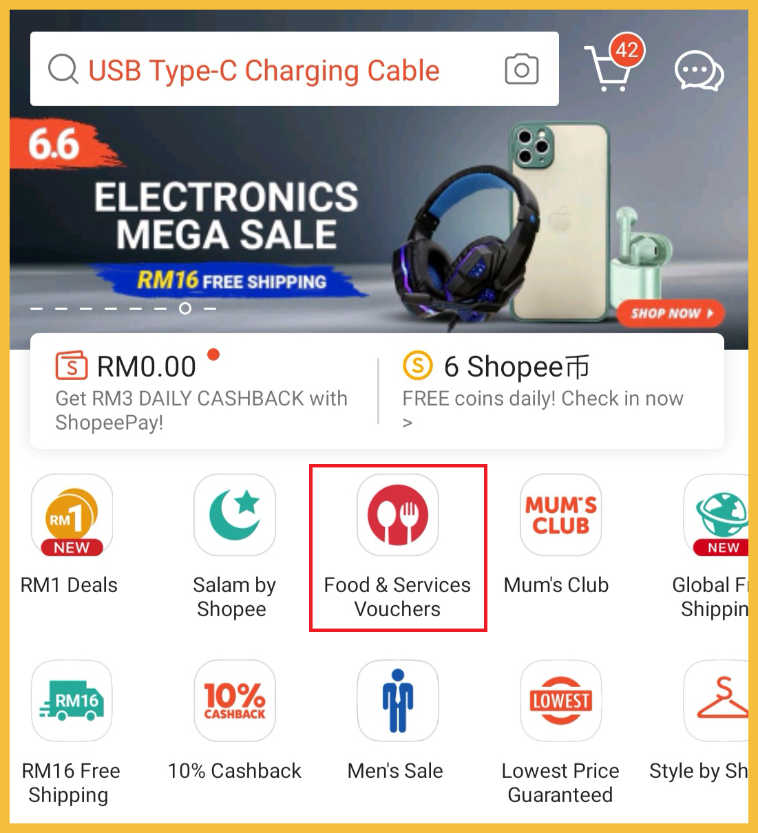 步骤1:你只需打开 Shopee App 点击「Food & Service Vouchers」