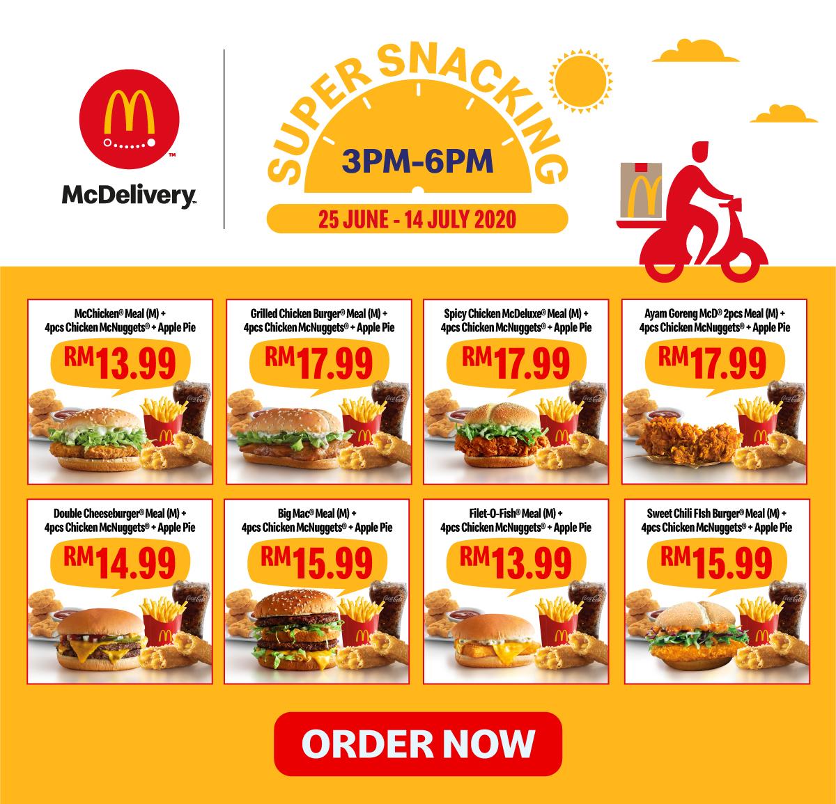 即日起,麦当劳推出「Super Snacking & Super Savers 」美食大优惠。只要你通过 McDelivery 订购麦当劳的指定套餐就可享有折扣高达50%大优惠!