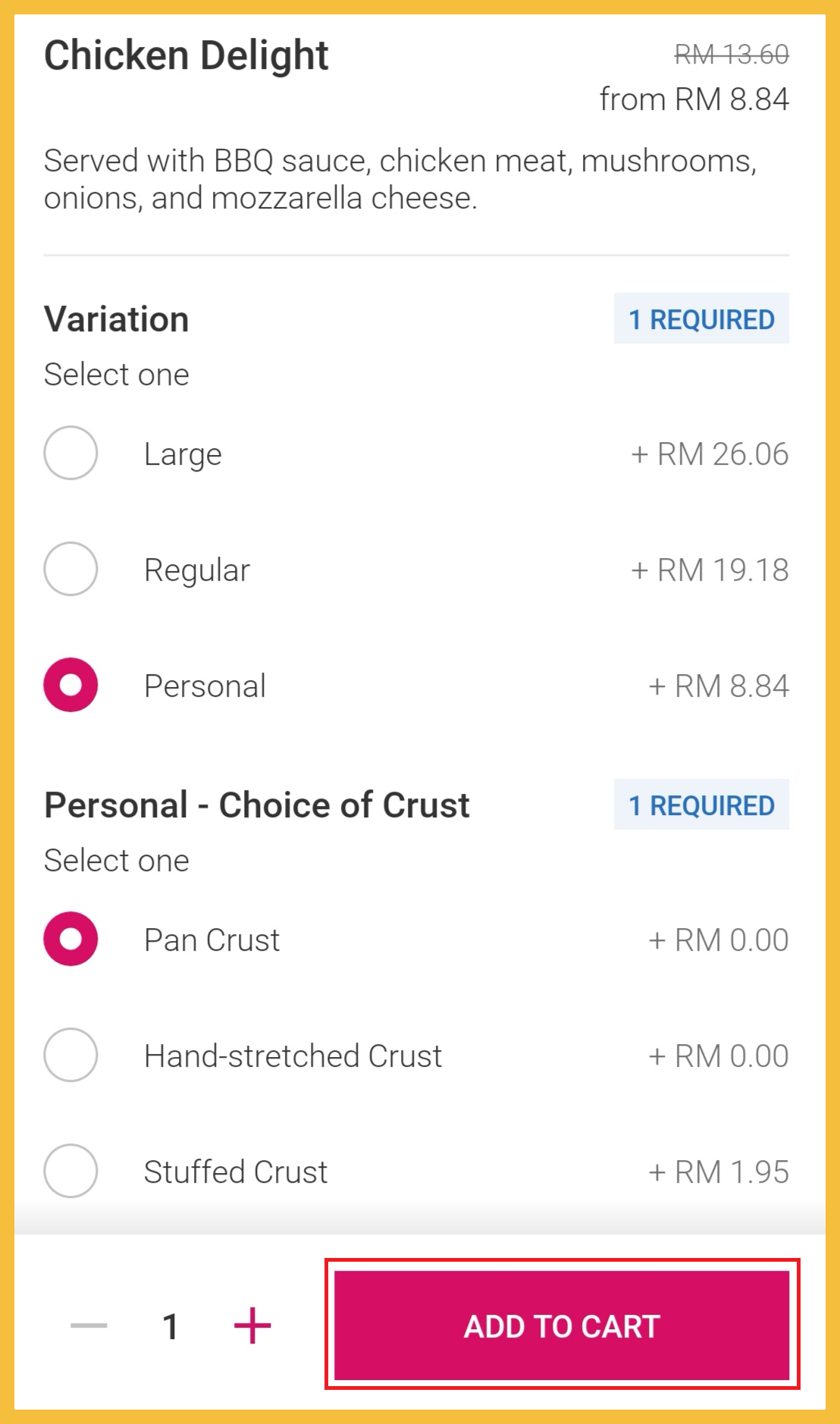 步骤 3:选择 Pizza 的尺寸及饼皮款式后,点击「Add Your Cart」!