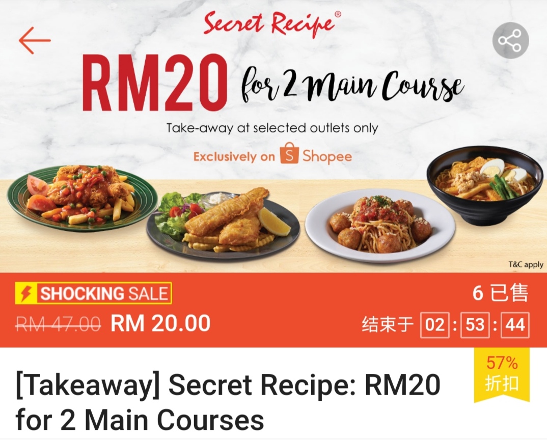 促销活动:Secret Recipe 与 Shopee 联合推出2份主食美食只需RM20