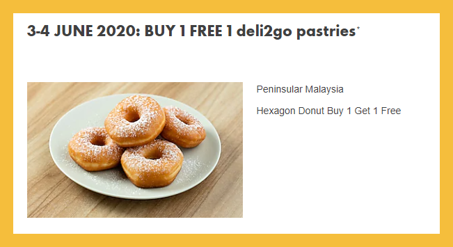 促销条件:客户仅限于在一个单位购买一次的 RM1 优惠商品或 Deli2go Pastries