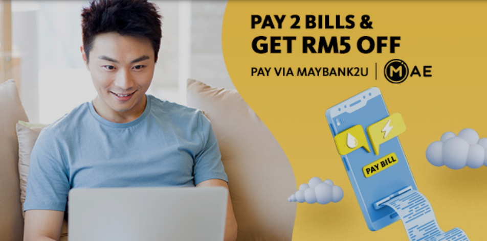 从即日起,只要你通过 Maybank 的 Maybank 2u 或 MAE 缴付2张不同的账单,就可享有 RM5 现金回扣。