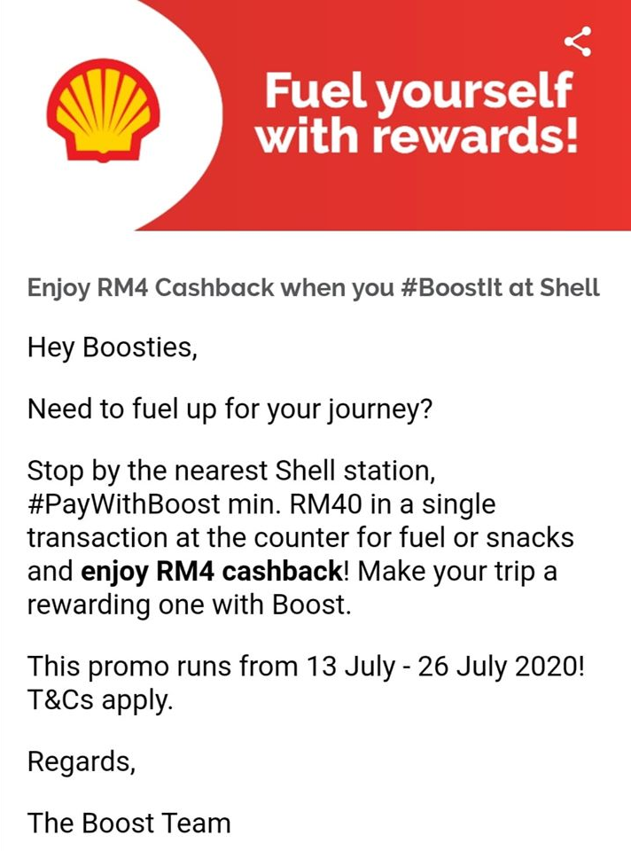 - 添油或消费满 RM40 或以上,并使用 Boost 中的“pay”付款,可获得 RM4 现金回扣