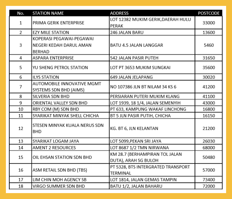促销地点:大马 Shell 油站分行(除了以下这些油站分行)
