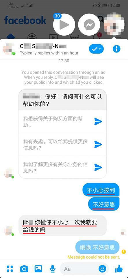 原来是原PO在滑 Facebook 的时候不小心点进一个广告私讯。原PO非常有礼貌地写道:「不小心按到,不好意思。」