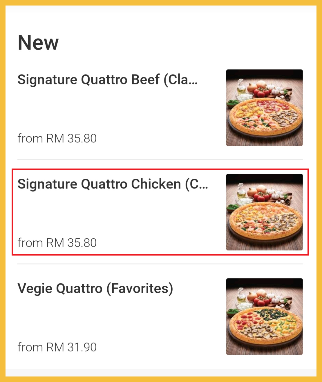▼ 步骤2:选择你想吃Pizza,例如:Signature Quattro Chicken (Classic)