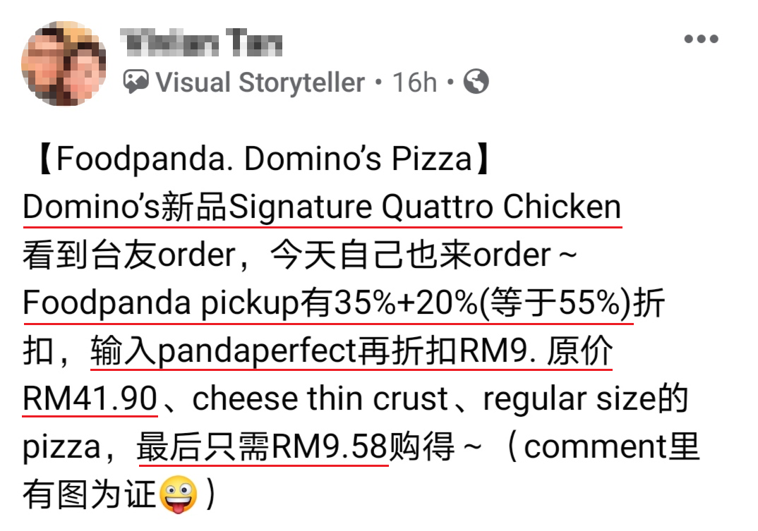 就在昨日,一名网友在《吃的平台》的群组内分享:自己在 Foodpanda App 中点了一份 Domino’s Pizza 新品「Signature Quattro Chicken」只需RM9.58。