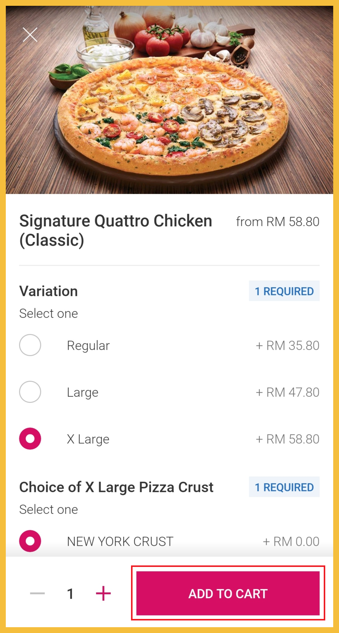 ▼ 步骤2:选择你想吃Pizza,例如:Signature Quattro Chicken (Classic)