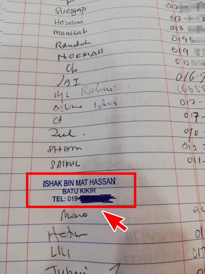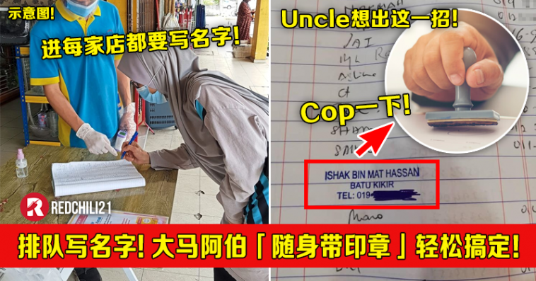 这时候厉害啦!阿伯默默地从口袋里拿出一个东西,打开盖子、在记录本上盖章!清清楚楚地名字和联络号码就印在记录本上了!轻松搞定!