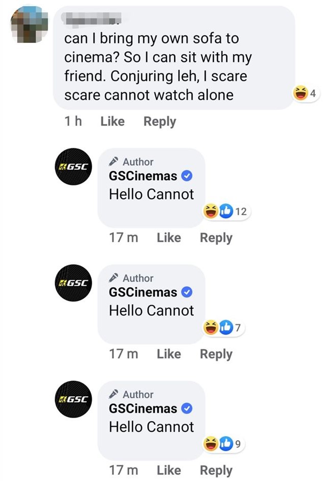 ▼「我可以带自己的沙发去电影院吗?这样我就可以跟我的朋友一起坐了。Conjuring 咧,我怕怕,不敢一个人看。」