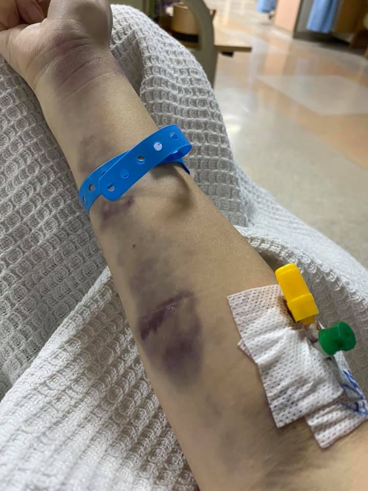 他们帮我量血压、scan baby 然后一直内检,还有另一个就负责找我的血管来插了又拔、拔了又插,就导致我的手都是针空洞,变得很严重。