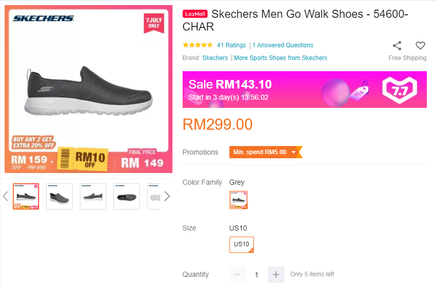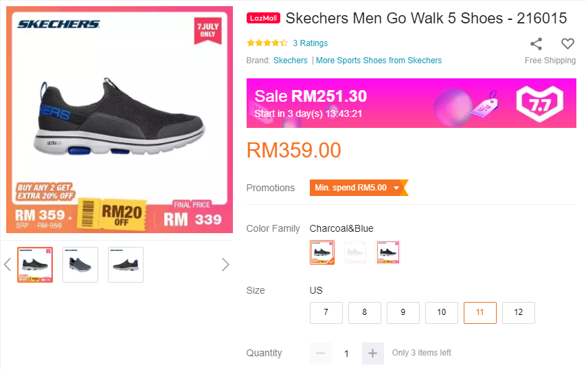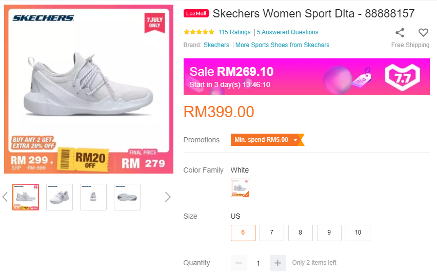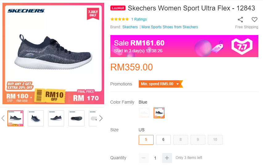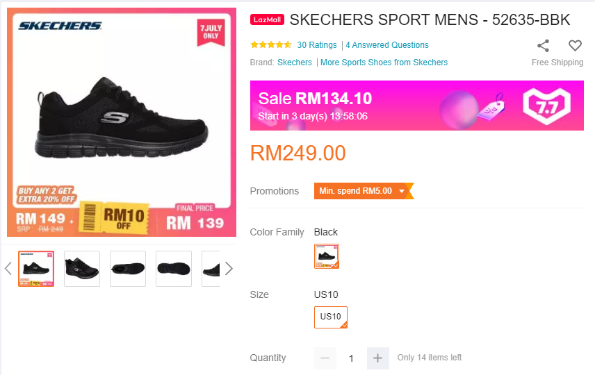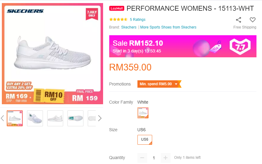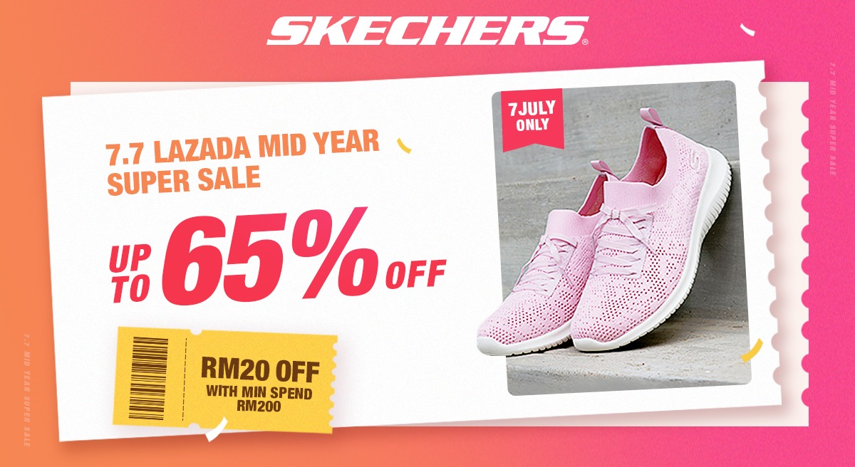 此外,在大马网购平台 Lazada 与 Skechers 网店联合推出【7.7大促销】,折扣高达65%!