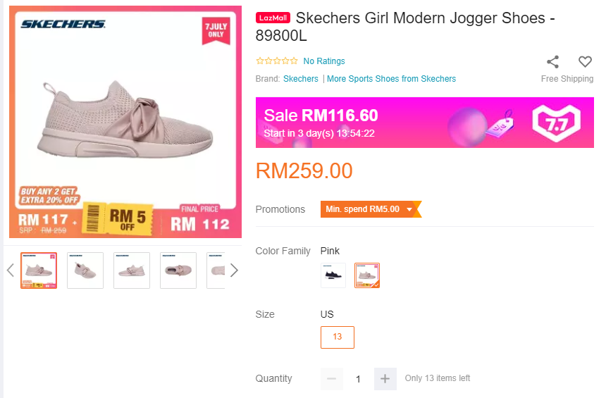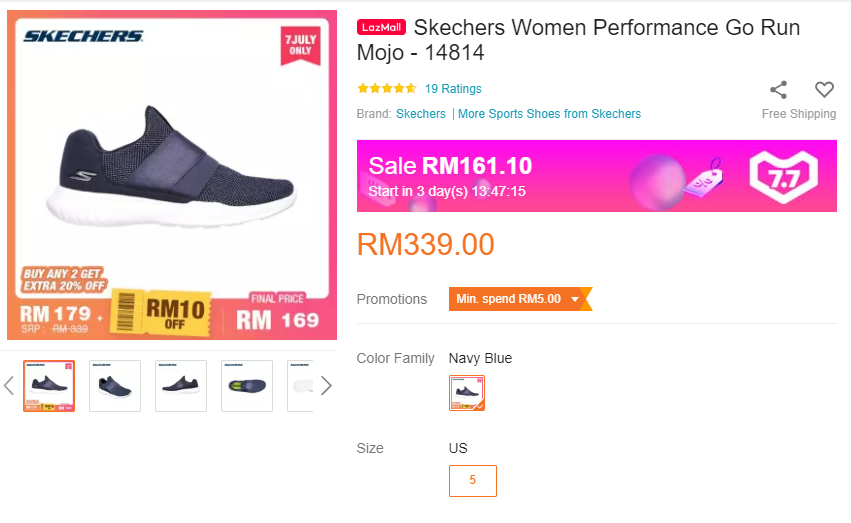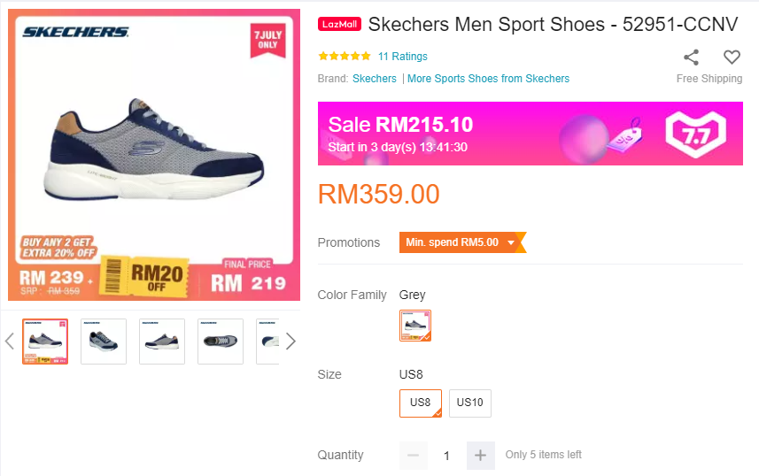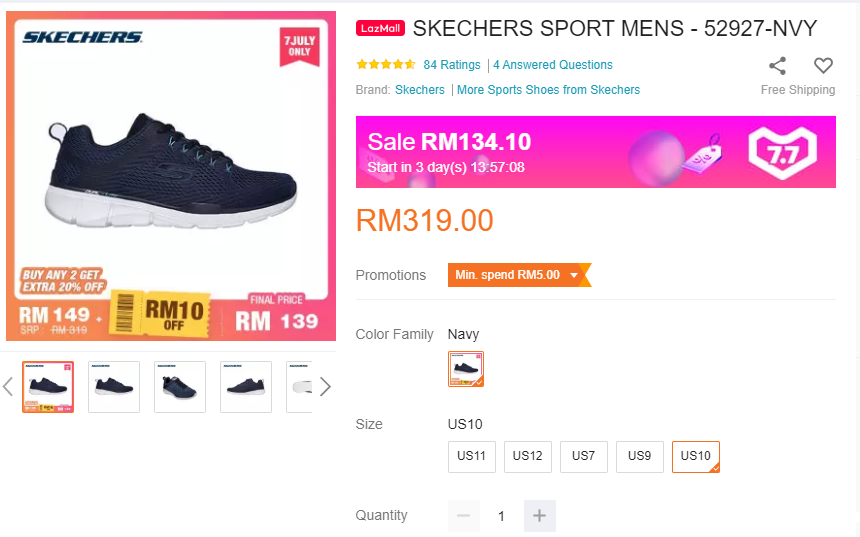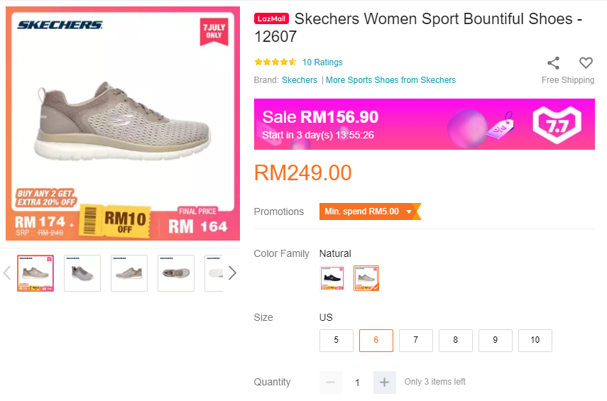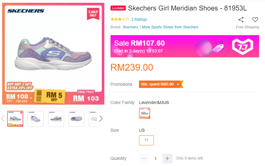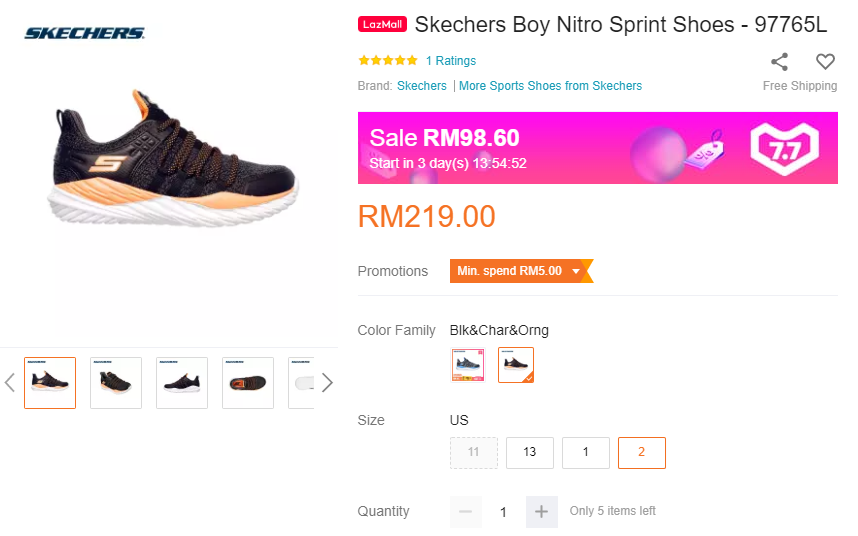 此外,在大马网购平台 Lazada 与 Skechers 网店联合推出【7.7大促销】,折扣高达65%!